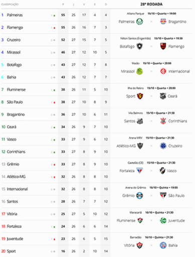 O Grêmio ocupa a 13ª posição, com 33 pontos, enquanto o Internacional aparece logo atrás, em 14º, com 32 pontos. Caso não consigam subir na tabela, restará apenas a disputa da Copa Sul-Sudeste, torneio reservado para clubes que não alcançarem os torneios continentais.