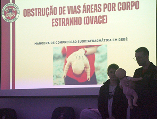 Também foram repassadas técnicas em casos de engasgamento, inclusive em bebês. “Um dos métodos para desengasgar é a tapotagem, um procedimento que consiste em colocar o bebê apoiado no antebraço na mãe, com a cabeça para baixo, numa inclinação em cerca de 45 graus. Em alguns casos a própria gravidade já tende a desobstruir. Se continuar engasgado, é necessário fazer algumas batidas nas costas do bebê. Normalmente são cinco movimentos e na maioria dos casos já resolve. Às vezes é preciso repetir esse procedimento”, explicou o tenente.