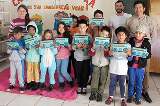 - As crianças foram presenteadas com um estojo da campanha em parceria com a Acaert