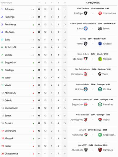 Pelo Brasileiro, a agenda também é movimentada. O Internacional entra em campo neste sábado, às 18h30, contra o Botafogo, em duelo marcado para o Estádio Mané Garrincha. Já o Grêmio joga no domingo, às 16h, diante do Coritiba, em casa. Na última rodada, o Inter perdeu em casa por 2x1 para o Mirassol no domingo e o Grêmio foi superado pelo Cruzeiro em Minas por 2x0 no sábado.